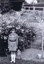 A photo of Anne Ogilvie in traditional Brownie uniform at the family home in Centaurus Rd. Working on badges like sewing and first aid were important skills to learn. The Girl Guide biscuits were a favourite delicious memory.