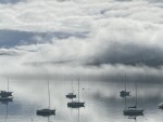 View of some boats on Akaroa Harbour as the low cloud lifts mid afternoon.