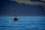 Seabirds circle a fishing vessel at the mouth of Akaroa Harbour.