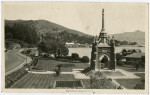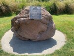 View of the commemorative stone on Akaroa's Beach Street and harbour to mark the 100th anniversary of the landing of French settlers to Akaroa in September 1840.