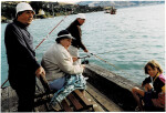 Jack Wood, Bob Wood, Joyce Wood and Louise Carpenter fishing off the wharf in Akaroa.