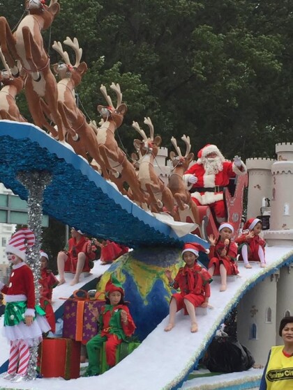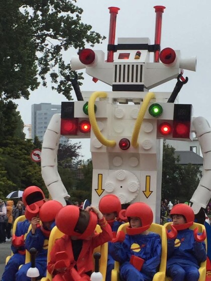 Portrait view of Judy Clancy holding a trophy. She is wearing roller skates and a sequinned costume. Unidentified people wearing suits are visible standing behind her.