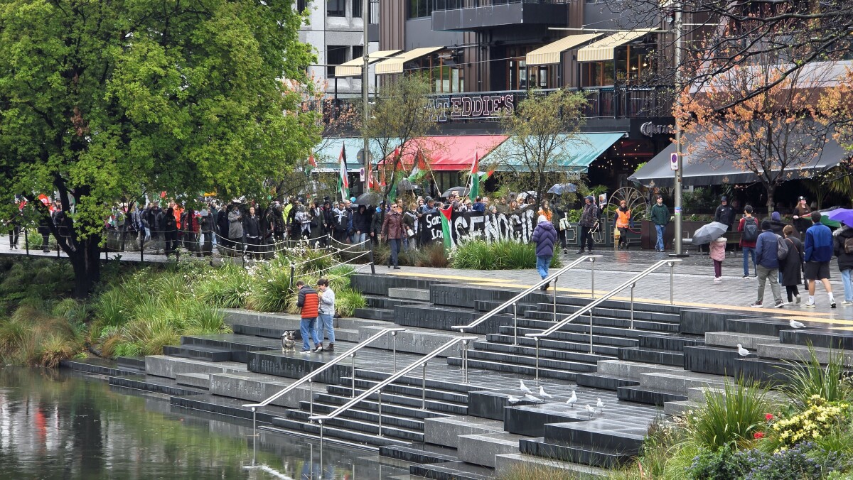 Free Palestine protest with 'GENOCIDE' banner and flags making its way down Oxford Terrace.