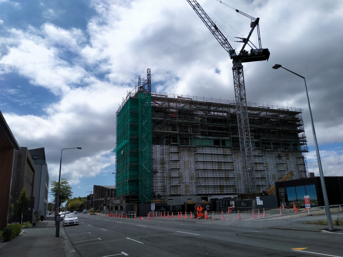 Tower crane rising above the Wyndham Garden building under construction, scaffolding in place and windows installed on the lower levels.