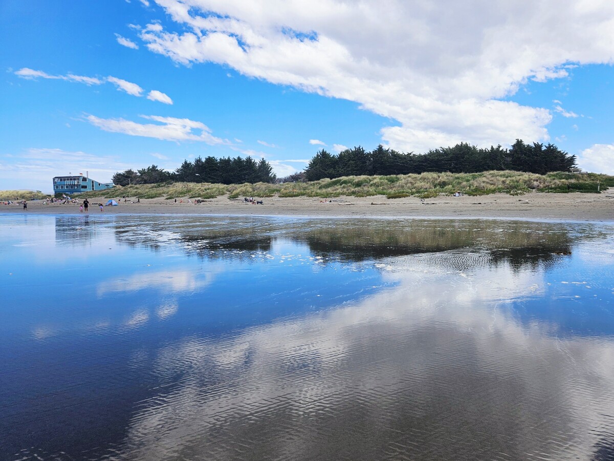 Blue skies above Waimairi Surf Lifesaving Club, reflected in a shallow pool in the beach’s intertidal zone.