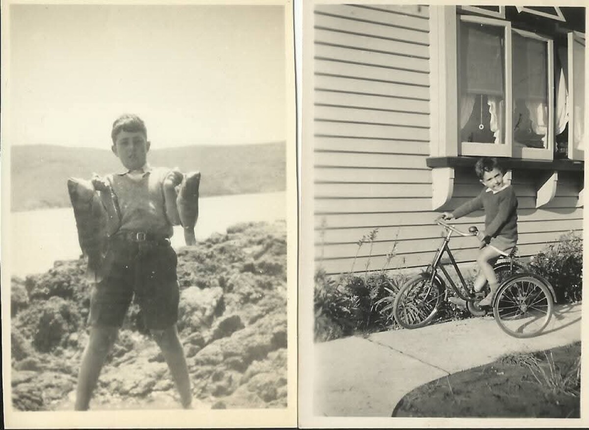 Portraits of Peter J. Jackson, one with a brace of fish and another on his tricycle.