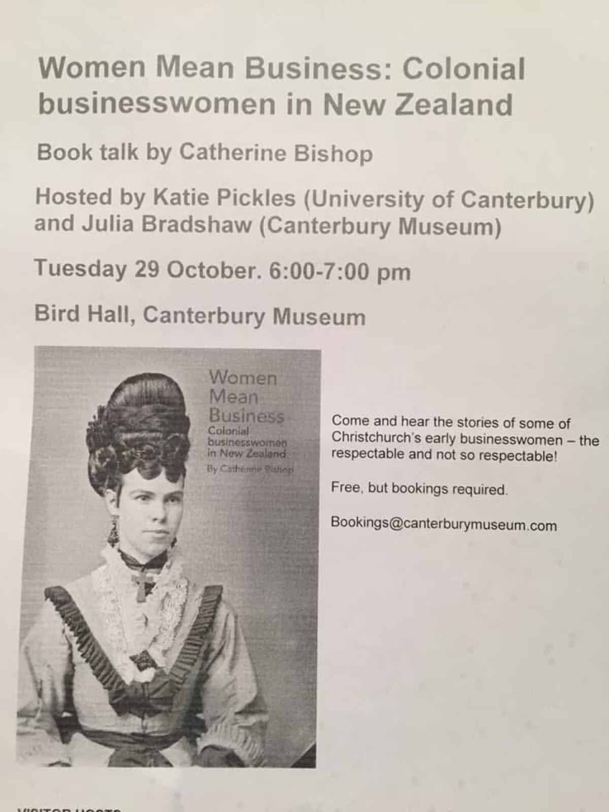 Canterbury Museum held a number of meetings and talks over the years. This is an advertisement for the book talk by Catherine Bishop, hosted by Katie Pickles and Julia Bradshaw at the Bird Hall in the Canterbury Museum.