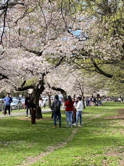 Crowds of people enjoying the blossom trees in Hagley Park, ...
