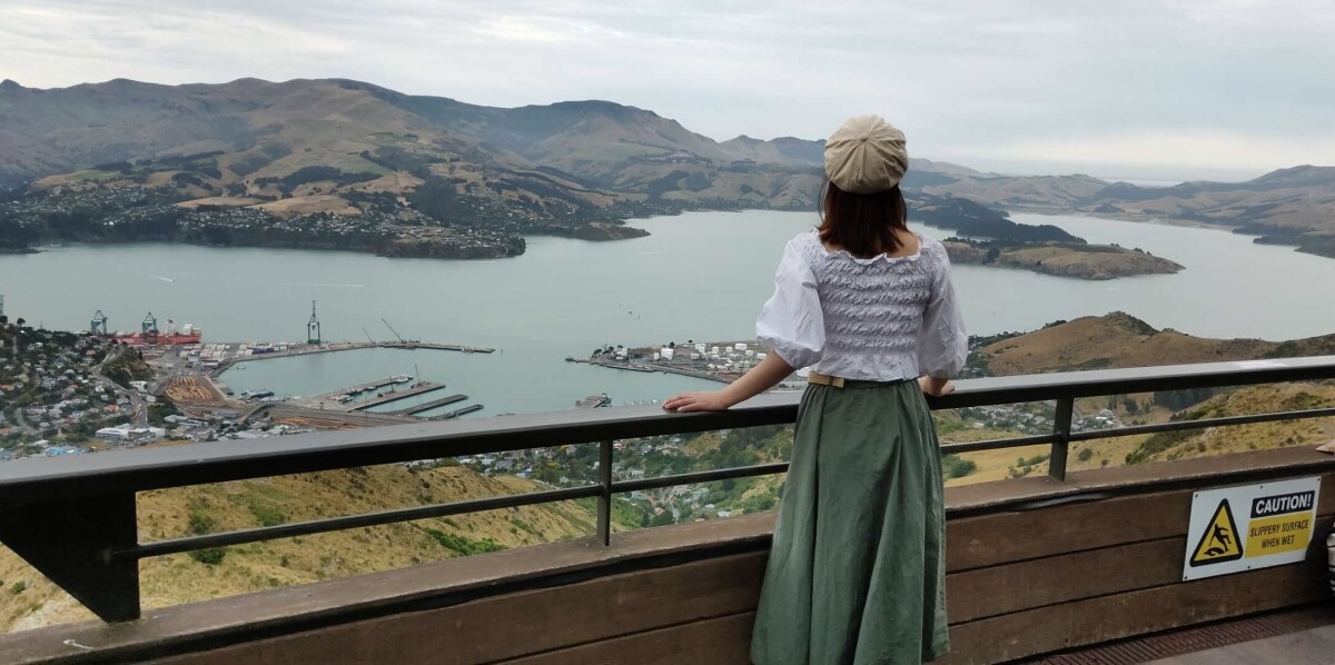 Portrait of Tina Chen looking over Lyttelton Harbour from Bridal Path.