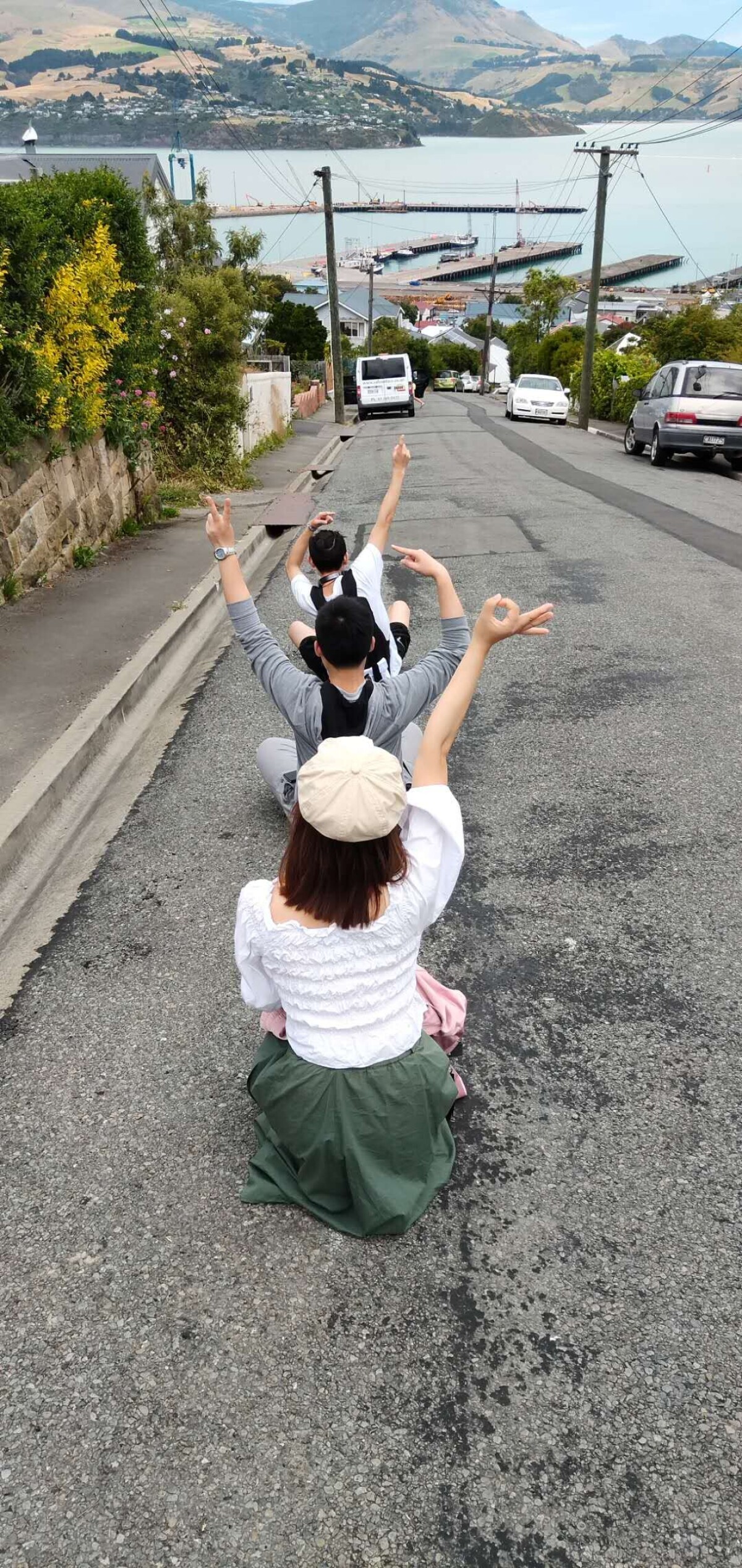 Four people seated on Cornwall Road, Lyttelton, overlooking the port and Diamond Harbour.