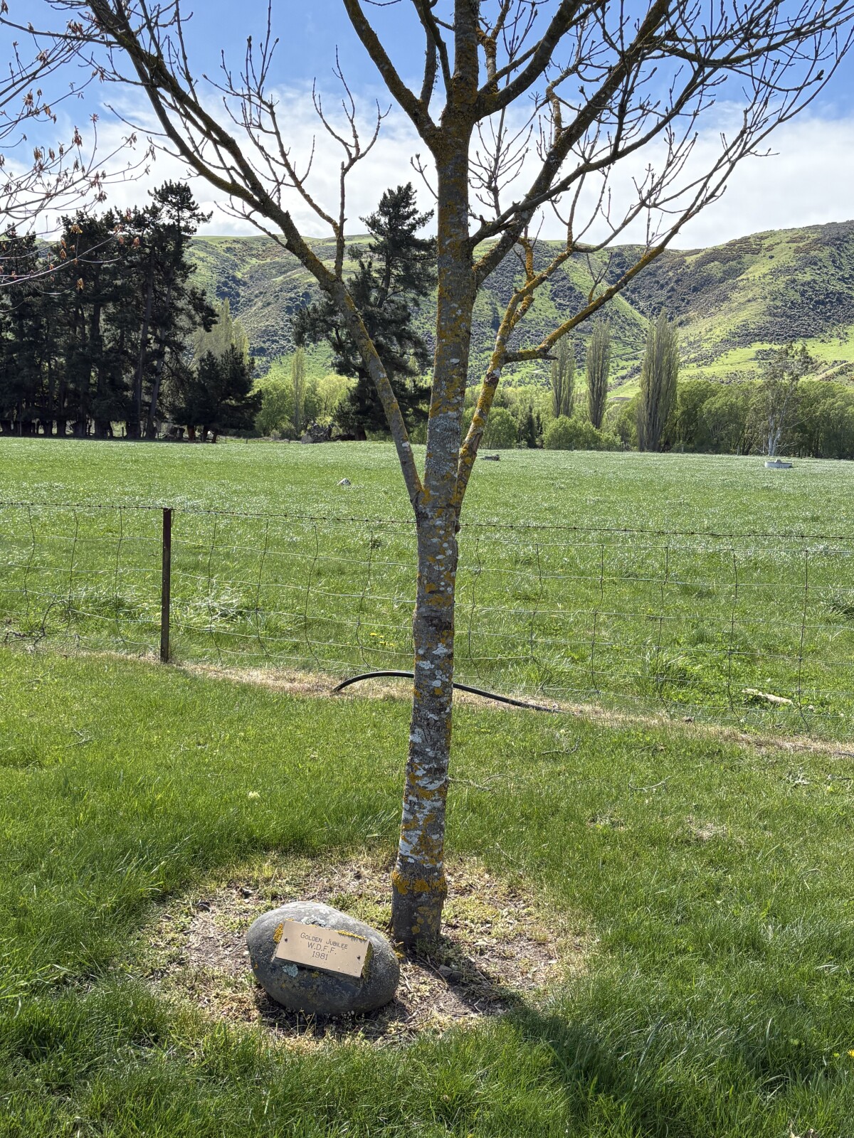 Contributors note: "Albury War Memorial on Albury-Fairlie Road on 15th October 2025. Shows a plaque under a tree for the golden jubilee W. D. F. F. In 1981."