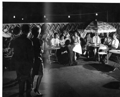 Couples dancing on an outdoor dance floor at the coffee house, ...