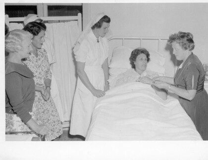 Two Red Cross nurses demonstrating first aid techniques to a ...