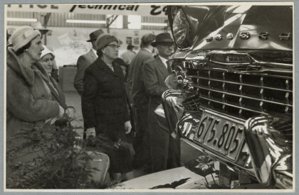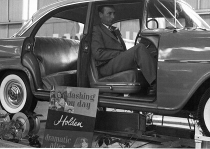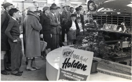 Well dressed men and women viewing a 1961 Holden vehicle on ...