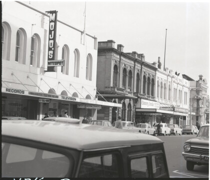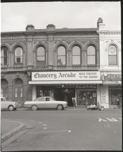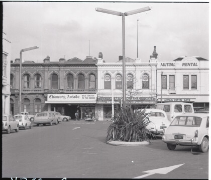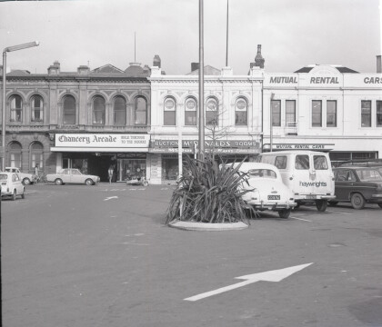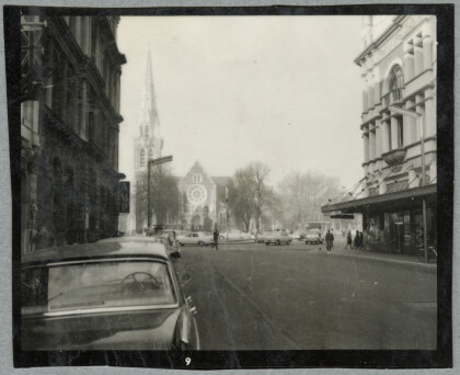 View of Worcester Street and Cathedral Square. Cars are parked ...