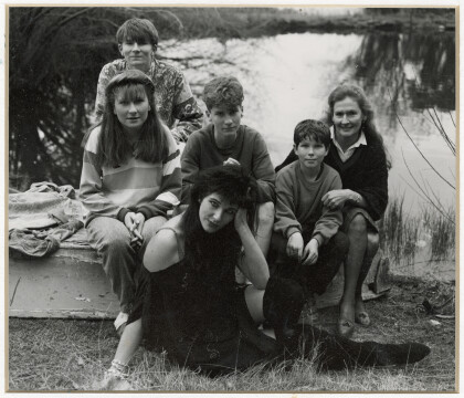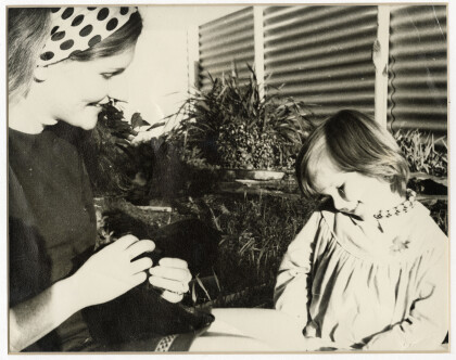 Jennifer Barer sitting in a garden with a young child. She has a ...