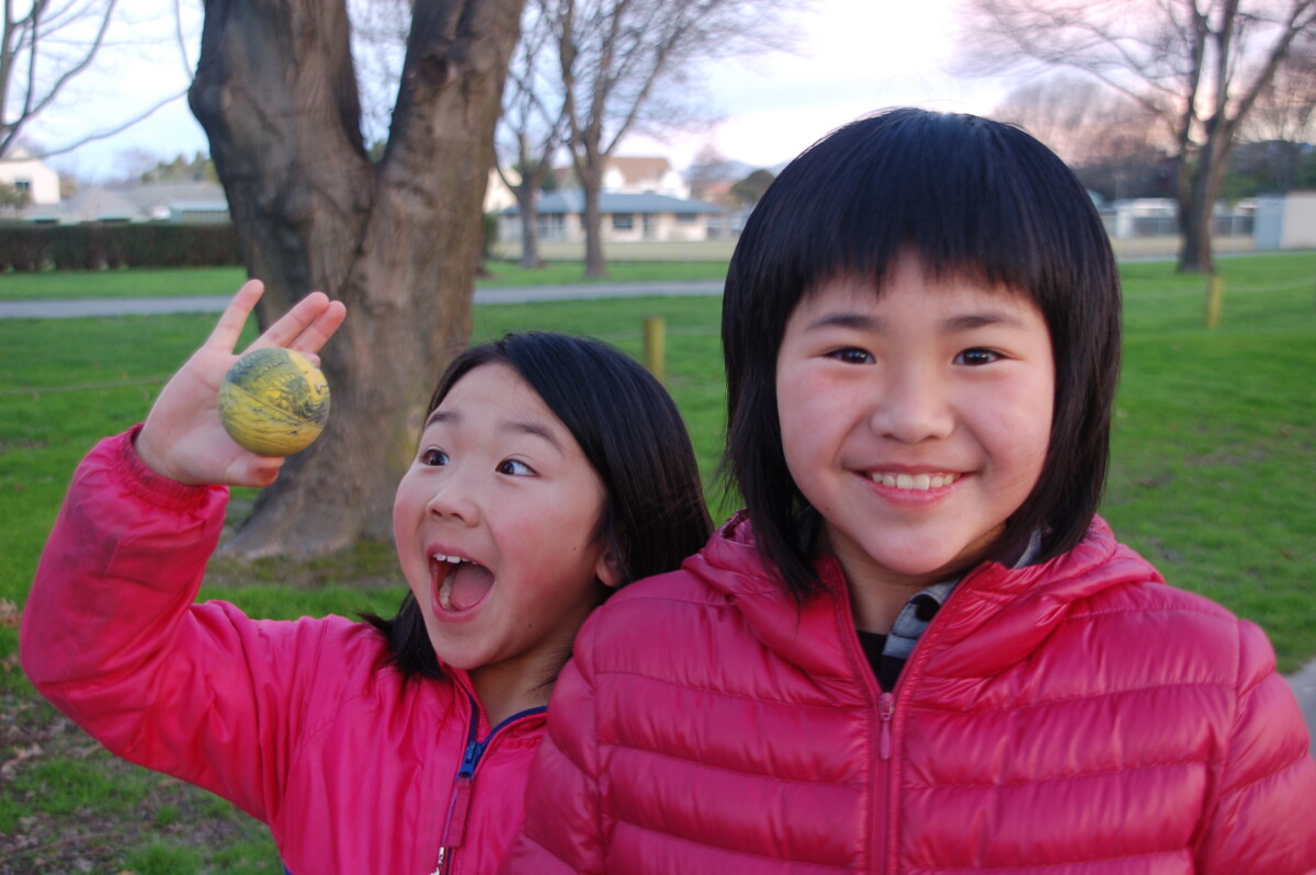 View of two children with Fendalton Park visible. One is holding a bouncy ball.