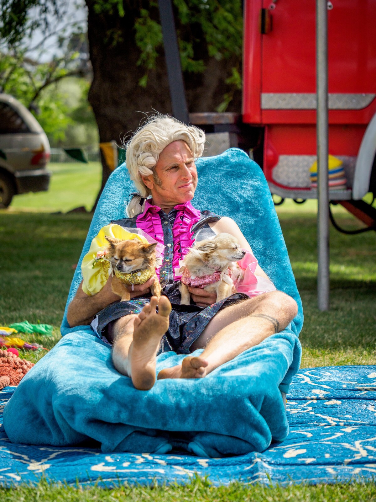 Daddy Ashton relaxing with the pooches during Dylan Daisy's Magic Show at the The Extravaganza Fair in the Redzone.