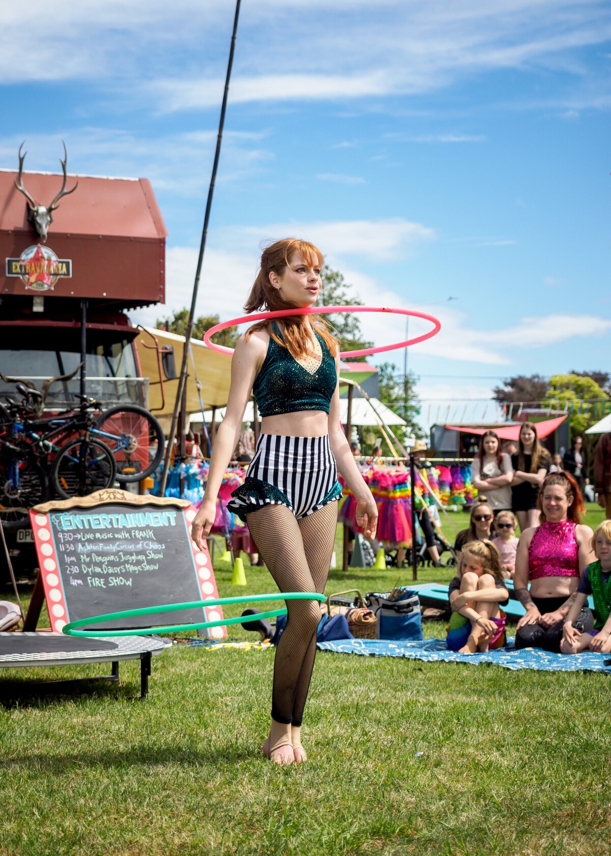 Dylan Daisy Ashton dances with two hula hoops performing with the Ashton Family Circus at The Extravaganza Fair in the Redzone.