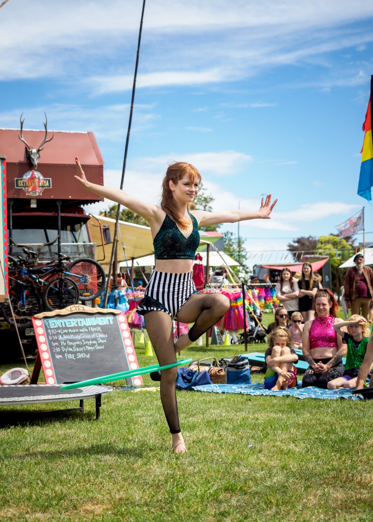 Dylan Daisy Ashton balancing with a hula hoop on one leg performing with the Ashton Family Circus at The Extravaganza Fair in the Redzone.