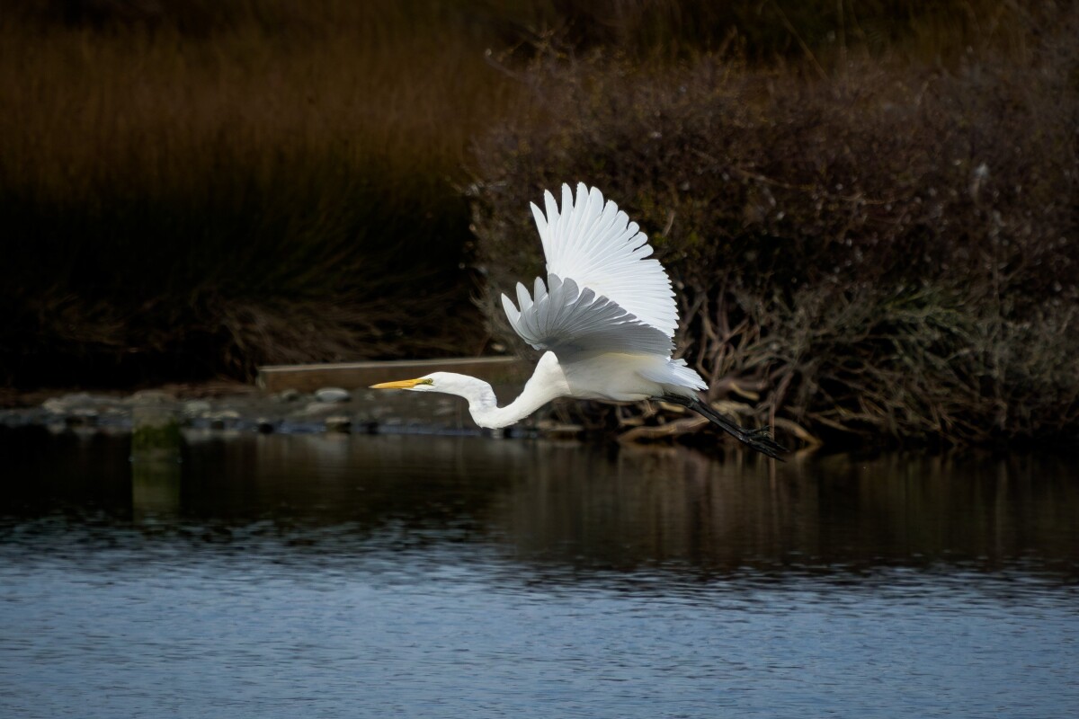 A white heron/kōtuku flying low over the water at Bexley Wetland.