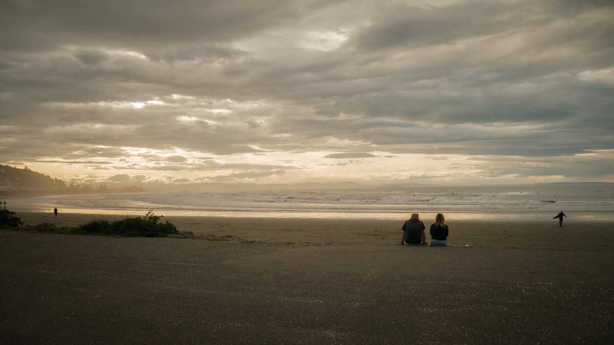 Sumner Beach at sunset, a couple are sitting on the beach.