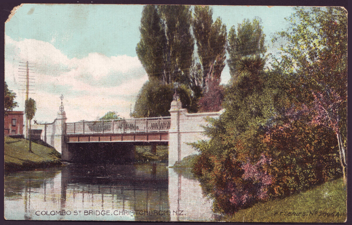 Printed annotation reads: Colombo St Bridge. Christchurch. NZ. F.T Series No 2096A
