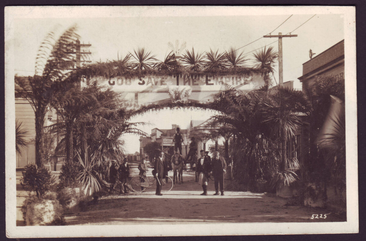 View of the borough arch in Hokitika with God Save the Empire banner for the visit of the Prince Wales. A horse and a cart and people are standing in the streets.