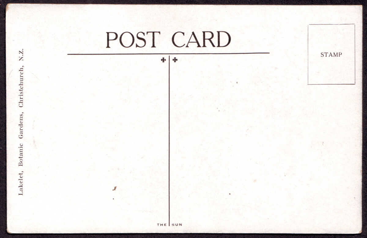 The reverse of "Lakelet, Botanic Gardens, Christchurch” postcard.