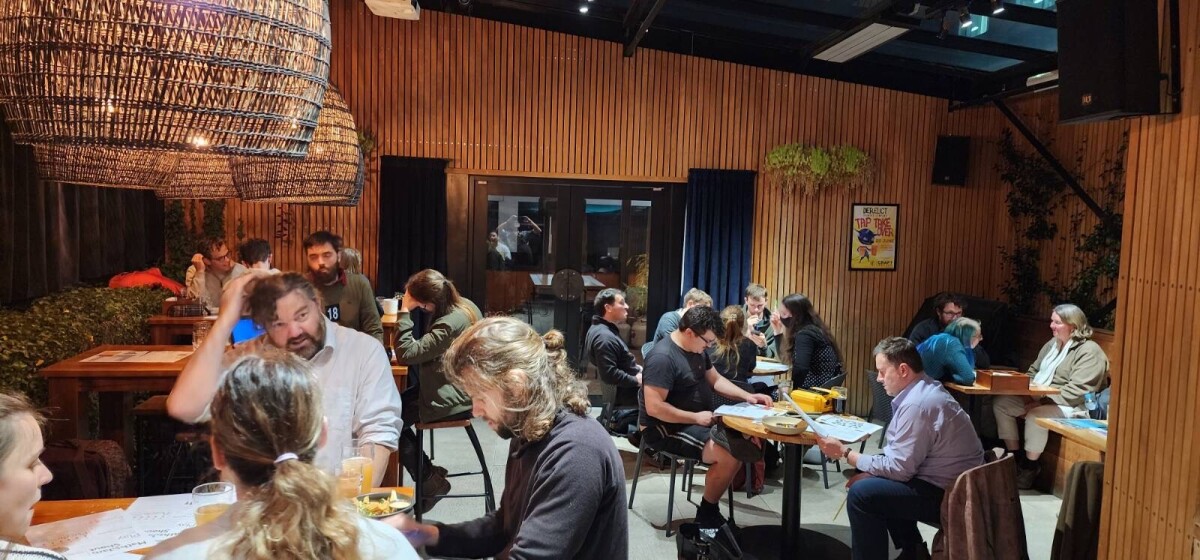 Contributors note: "Christchurch MathsJam meetup in The Craft Embassy's greenhouse pavilion room on Oxford Terrace, July 2023. MathsJam has been running in Christchurch since 2017, meeting on the third Tuesday of each month. It is open to all adults who want to meet up in a pub and solve puzzles / do recreational mathematics!"