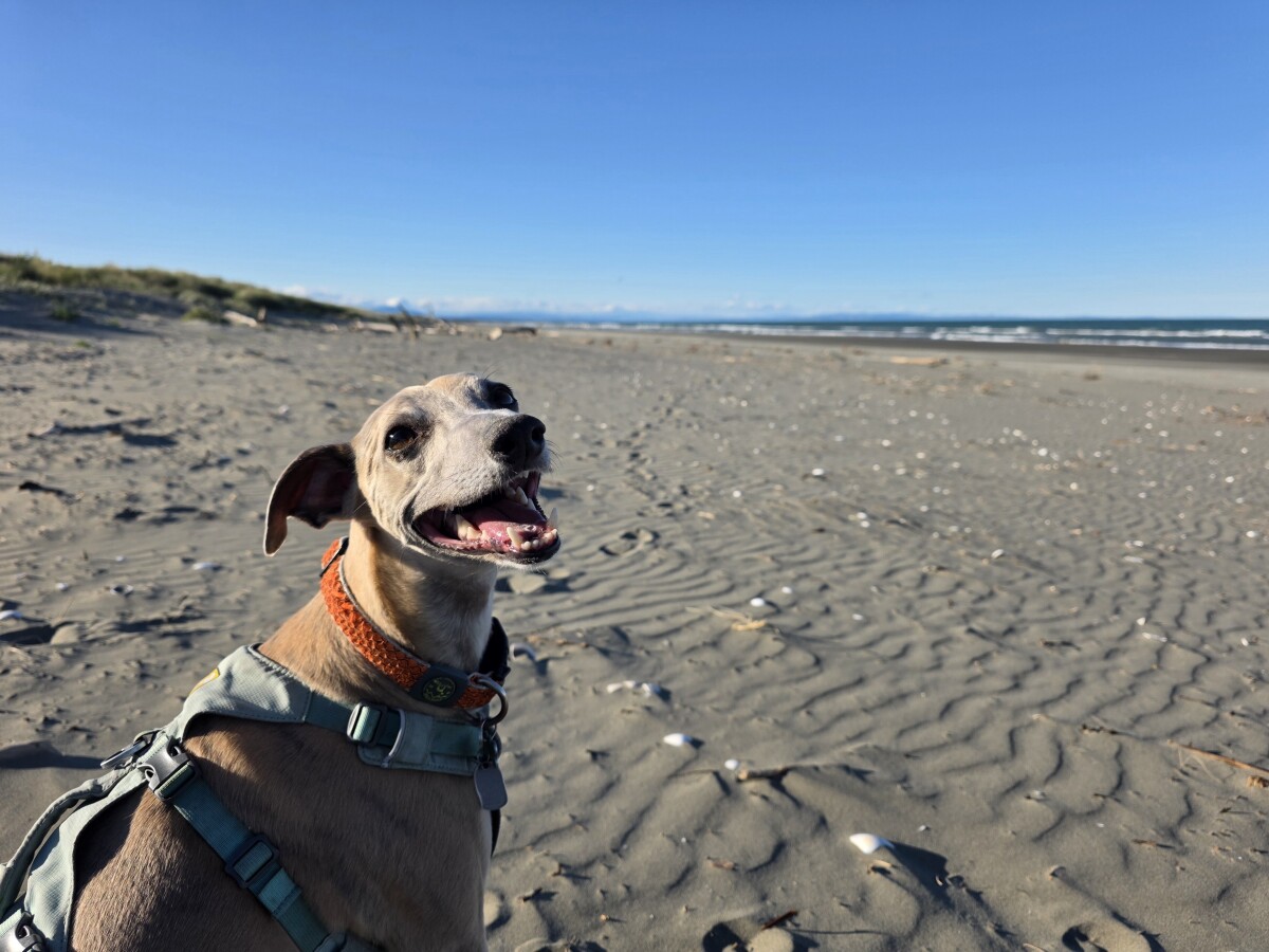 Stevie the whippet sitting on the sand at New Brighton Beach.