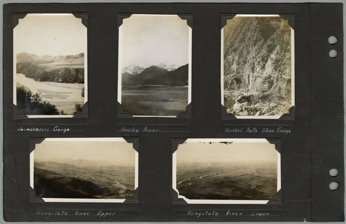 Page 2 of photograph album. Views of various Canterbury rivers and gorges. [Top left] Looking down on the Waimakariri River and gorge. Caption: Waimakariri Gorge. [Top centre] View over the Bealey River. A snow-capped mountain range is visible in the background. Caption: Bealey River. [Top right] Bridal Falls in the Otira Gorge. Caption: Bridal Galls Otira Gorge. [Bottom left] The upper section of the Rangitata River flowing across the Canterbury Plains. Caption: Rangitata River Upper. [Bottom right] The lower section of the Rangitata River flowing across the Canterbury Plains. Caption: Rangitata River Lower.