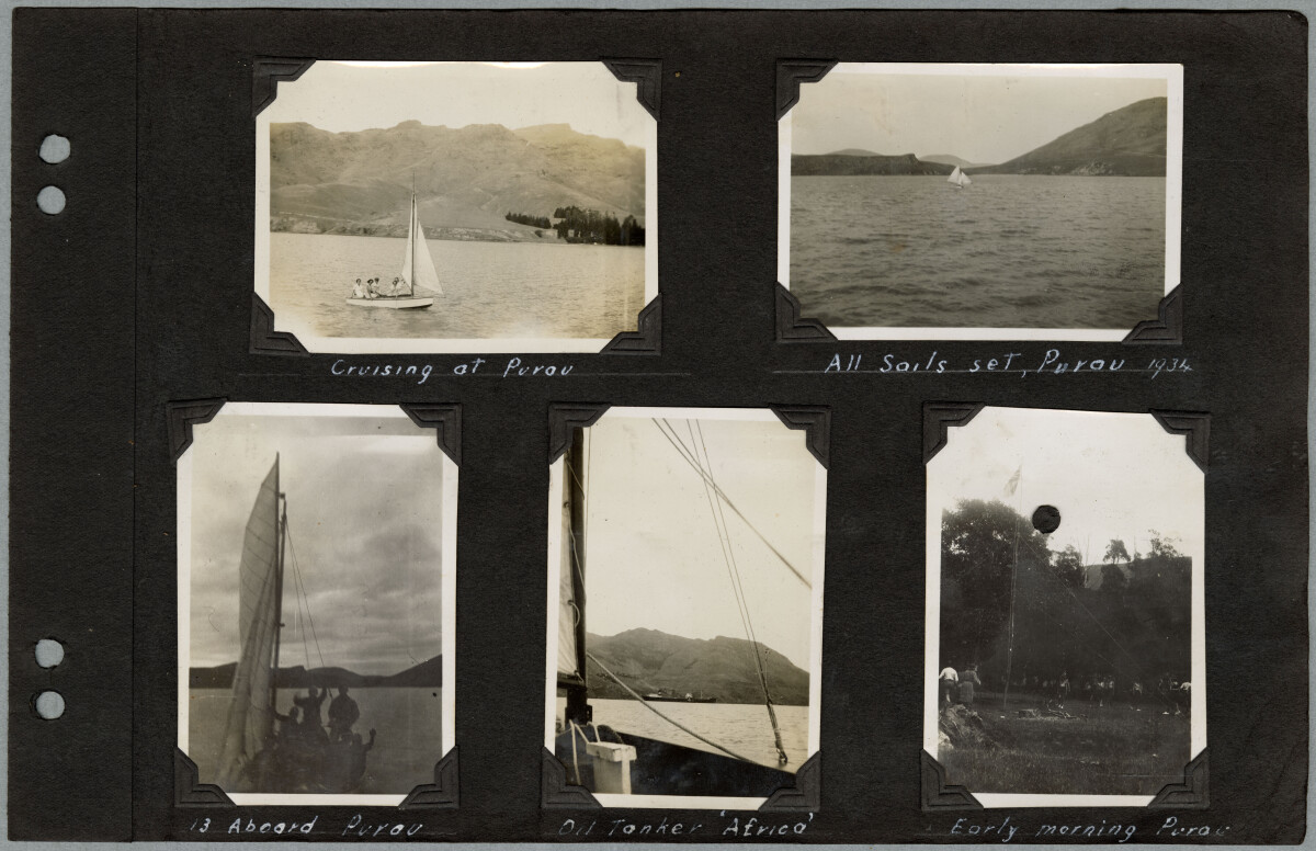 Page 7 of photograph album. Boats and ships on Lyttelton Harbour. [Top left] Sailing aboard Sunbeam at Purau. Caption: Cruising at Purau. [Top right] Unidentified sailboat at Puraru in Lyttelton Harbour. Caption: All sails set, Puraru 1934. [Bottom left] Thirteen sailors aboard the dinghy, Sunbeam. Caption: 13 Aboard Purau. [Bottom centre] View of oil tanker, Africa, in Lyttelton Harbour. Caption: Oil Tanker 'Africa'. [Bottom right] View of the flagpole in the campsite at Purau. The Union Jack flat is visible at the top of the flagpole. Caption: Early morning Purau.