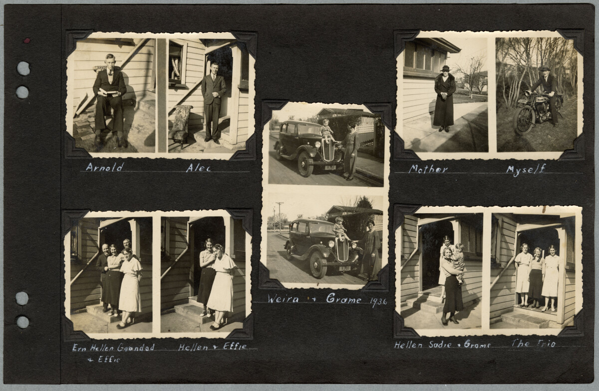 Page 23 of photograph album. Portraits of members of the Walsh family, at the family home in Vogel Street. [Top left] Portrait of Arnold, seated outside on a chair, holding a book. Portrait of Alec, standing at the back door entrance. Caption: Arnold Alec. [Centre] Grame sitting on the hood of a car, with Weira Walsh standing beside. Caption: Weira & Grame 1936. [Top right] Portrait of Lillian Jane Walsh, standing on the footpath outside her house. Portrait of Eddie Walsh, seated on a motorcycle. Caption: Mother Myself. [Bottom left] Group portrait of Ern Walsh, Hellen, Grandad and Effie Walsh standing at the back door of the family home on Vogel Street. Hellen and Effie Walsh standing at the back door. Caption: Ern Hellen Grandad & Effie. Hellen & Effie. [Bottom right] Group portrait of Hellen, Saide and Grame, standing at the back door. Group portrait of Effie, Sadie and Hellen, lined up at the back door of their Vogel Street family home. Caption: Hellen Sadie & Grame. The Trio.