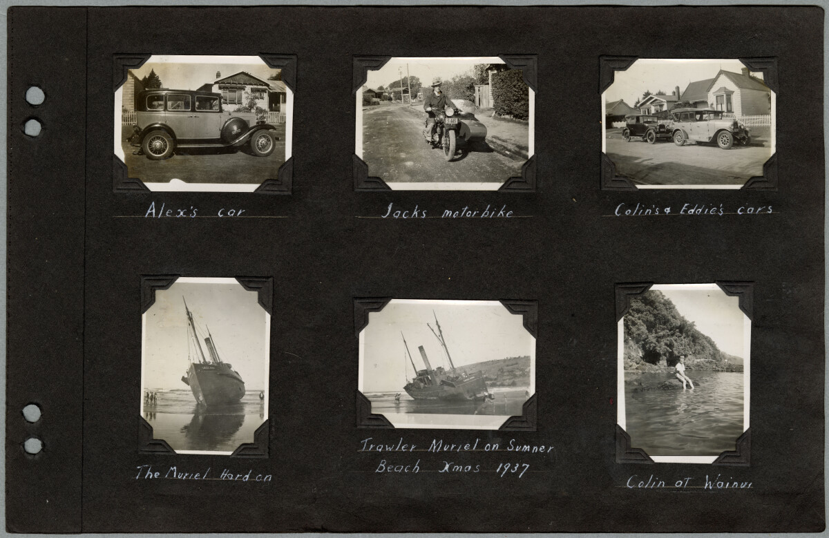 Page 59 of photograph album. Views of Walsh family cars and motorcycles, trawler, The Muriel, beached at Sumner and a family holiday snap at Wainui. [Top left] A car parked on the street outside residential houses. Caption: Alex's car. [Top centre] Jack Walsh, seated stationary on his sidecar motorcycle. Caption: Jacks motorcycle. [Top right] Colin and Eddie Walsh's cars, parked on on a residential street. Caption: Colin's & Eddie's cars. [Bottom left] The trawler, Muriel, stranded on Sumner Beach. Children can be seen playing in the water around the boat. Caption: The Muriel Hard on. [Bottom centre] Children playing in the shallows of Sumner Beach near where the Muriel trawler has run aground. Caption: Trawler Muriel on Sumner Beach Xmas 1937. [Bottom right] Colin Walsh sitting on a rock in the water at Wainui. Caption: Colin at Wainui.