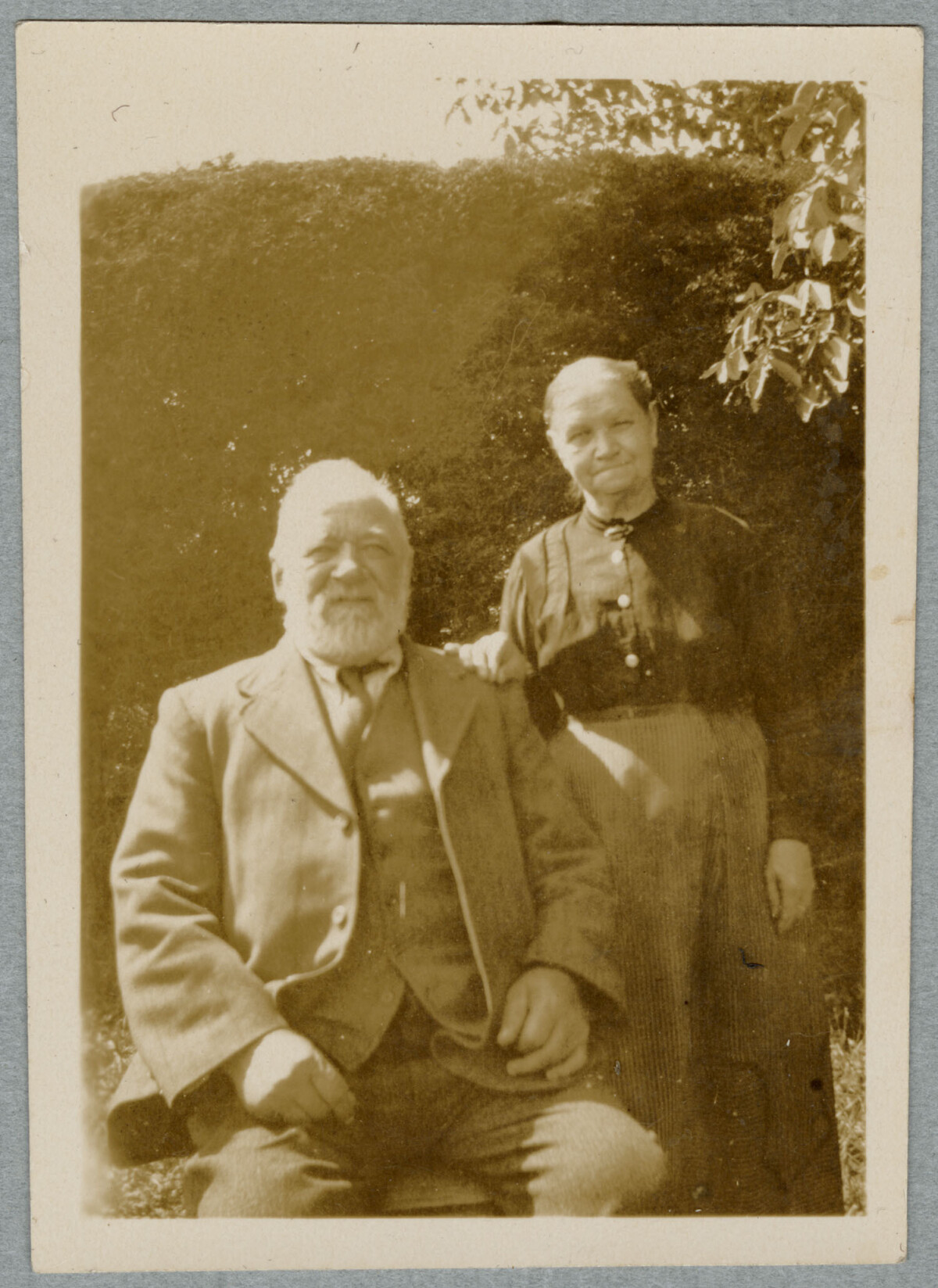 The photograph was one of two loose photographs in the photograph album between the pages 23 and 24. Portrait of James and Elizabeth Tree, foster parents to George Walsh. Handwritten annotation on reverse reads: Grandad & Grandma Tree. Grandad Walsh's parents.