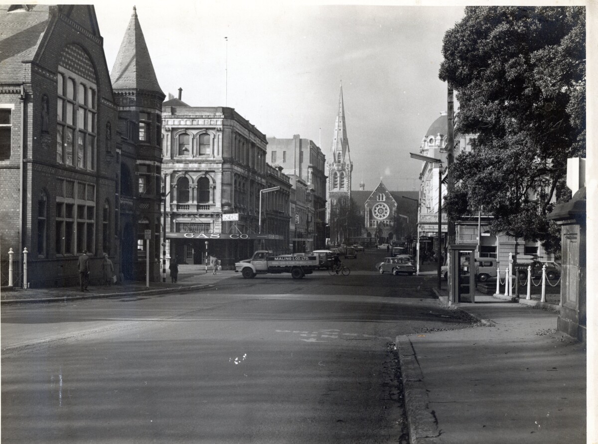 Contributors note: "1960s street view, looking eastwards along Worcester St towards Cathedral Square, shows people walking in the Square and various vehicles including, buses in Cathedral Square, cyclists, cars parked and driving, a Maling & Co. Ltd truck crossing the Worcester St and Oxford Tce intersection, gives way to pedestrians on a crossing, outside the Gas Company show room. NCR is the business next to Gas Co. Given the location of Maling & Co on the corner of Gloucester and Oxford Tce, this truck probably on the way there. There are no traffic lights in sight. On the opposite corner of Worcester St and Oxford Tce is the Clarendon Hotel, on this side one can see the Avon theatre, and the dome on the top of the Regent Theatre building on the corner of Worcester St and Cathedral Square. In the foreground on Worcester St is the Municipal building, and a phone box on the street opposite."