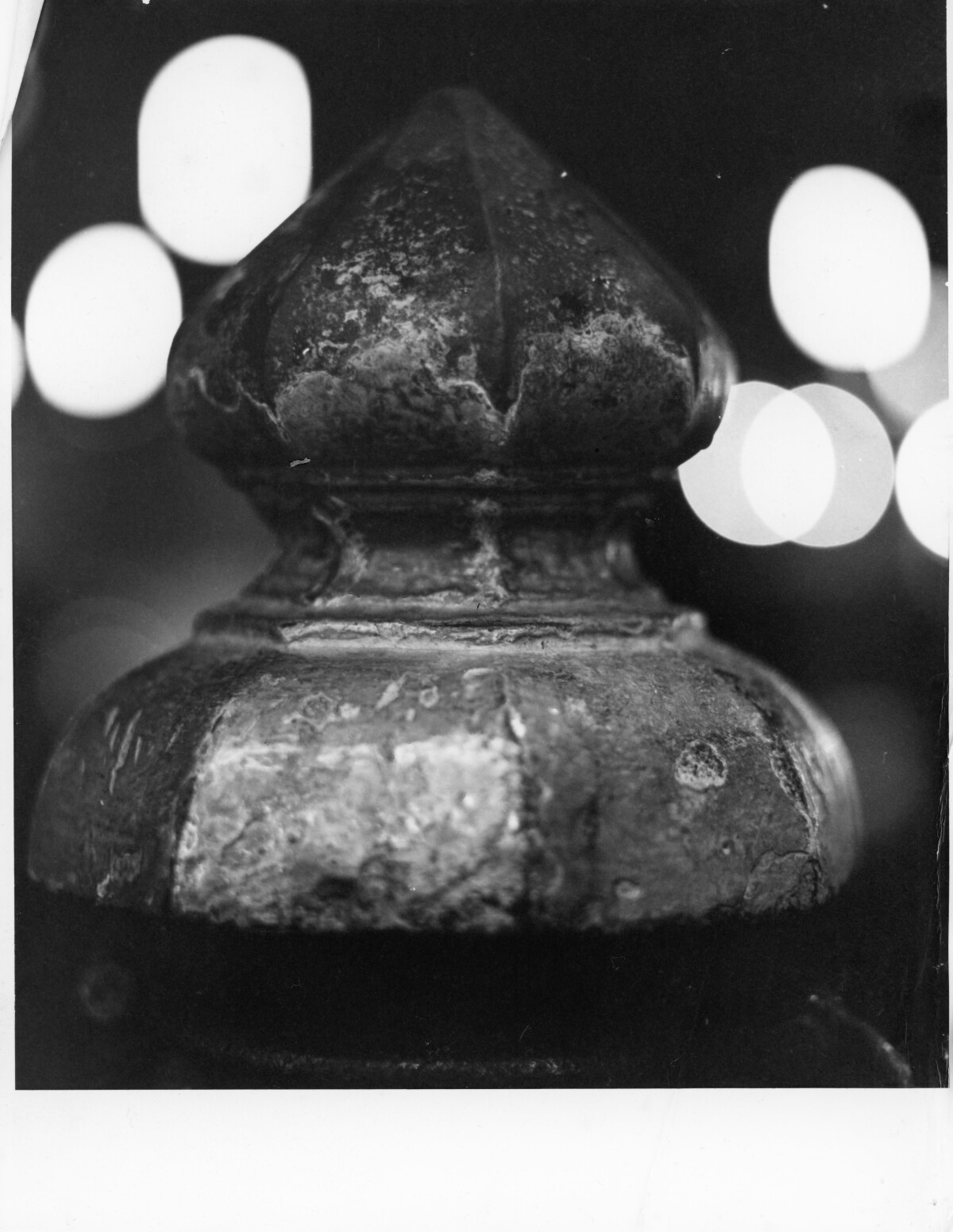 Close-up view of a decorative finial in Cathedral Square on a wet evening. The finial is lit by the surrounding street lights.
