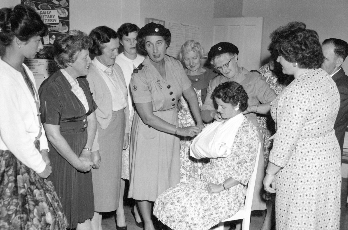 Contributors note: "Christchurch photos of a Red Cross First Aid course, February 1962. Nurses giving instructions to several well-dressed women, one man in a suit hovering in the background of one photo."