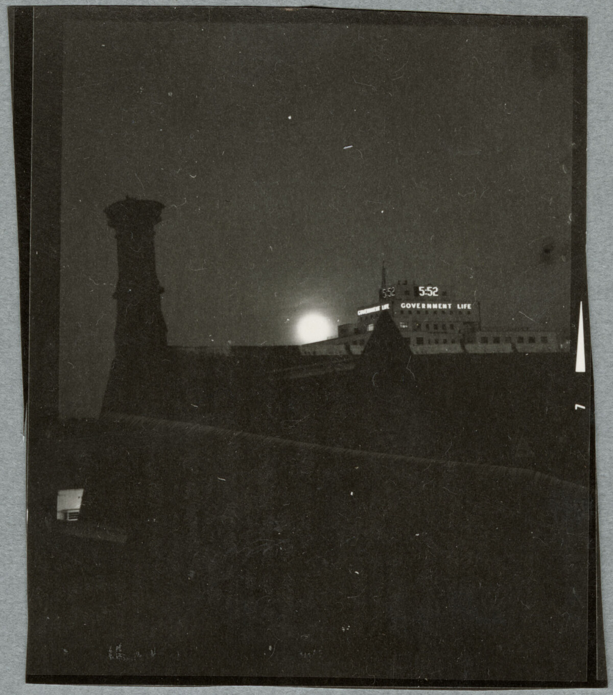 Contributors note: "Christchurch 1960s. Moon arising over the Government Life Building at 69 Cathedral Square, two sides of the clock atop the building are visible in this photo."