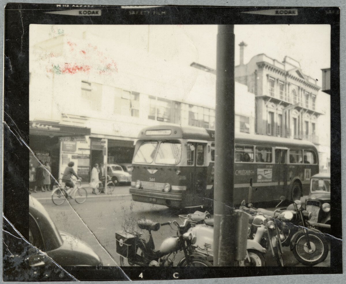Contributors note: "1960s Christchurch central city street view. Worcester Street, opposite left side is the Avon theatre and parking area. There are various vehicles, including a bus, parked cars and motor bikes, pedestrians, people waiting for a bus, and cyclists."
