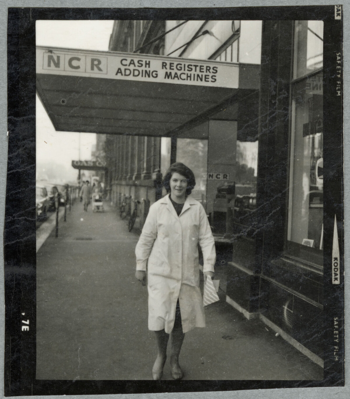 Contributors note: "1960s Christchurch. A lady (maybe an employee of this business) walking outside NCR, Cash Registers, Adding Machines, business on Worcester Street looking westwards towards Oxford Tce."