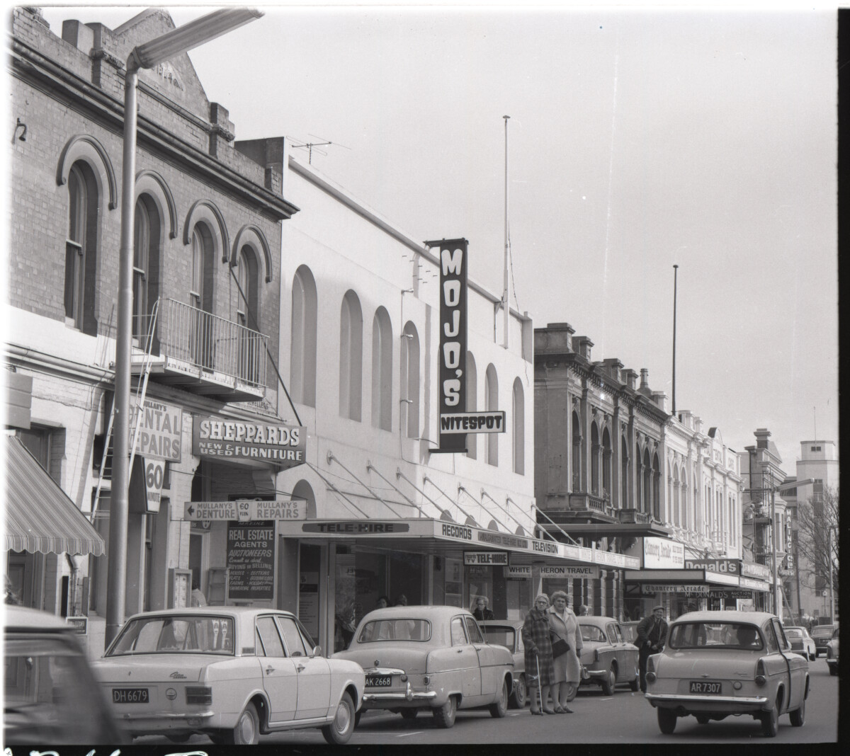Contributors note: "Early 1970s street view of Gloucester Street, looking westwards towards Oxford Tce showing buildings, number of businesses, people along the footpath, some about to cross the street, vehicles, outside Chancery Arcade entrance, street parking meters."