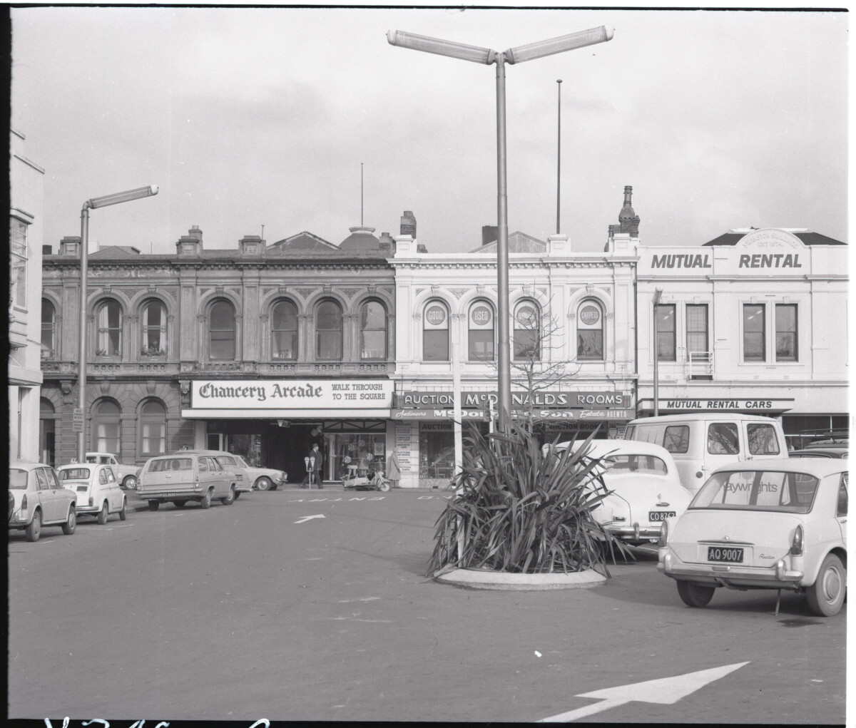 View of buildings situated on the southern side of Gloucester Street, between Colombo Street and Oxford Terrace. Identified businesses include Holy Cross Chapel, Chancery Arcade, McDonald's Auction Rooms and Mutual Rental Cars. The corner of Haywright's building is visible in left of the image.