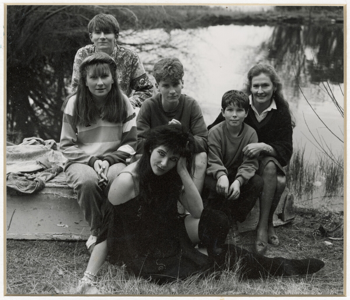 Family portrait taken in front of an unidentified body of water. Jennifer Barrer is seated on the far right.