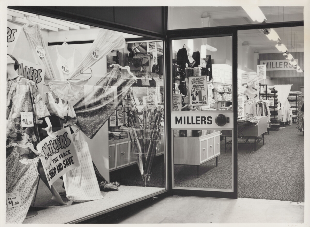 A window display at Millers department store, showcasing various ladieswear apparel.