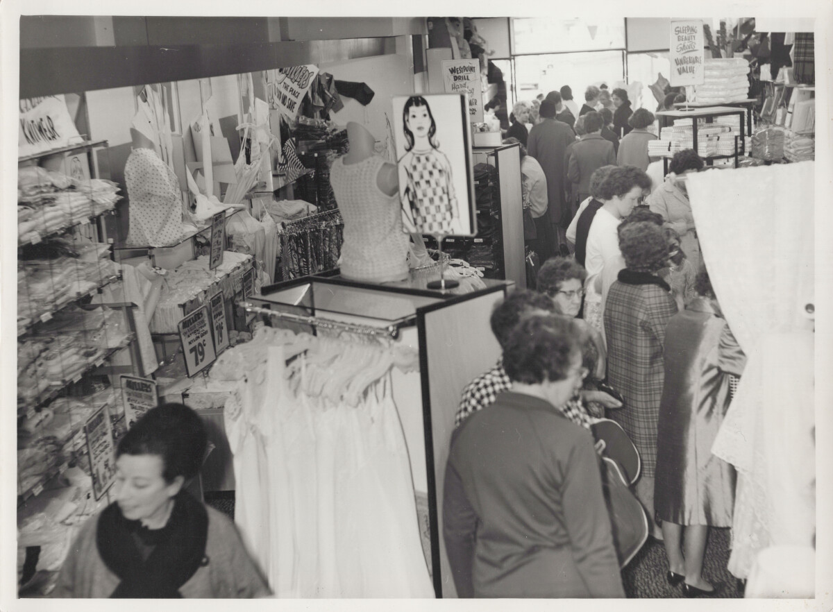 View from the rear of the Millers department store at the crowd of shoppers lined up to the door. The entrance is crowded and appears difficult to move about.