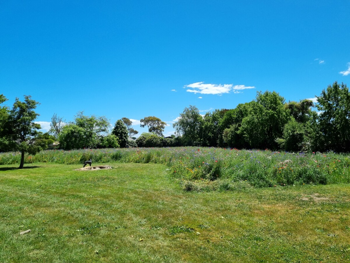A view of Linwood park wildflower garden, facing west. The wildflowers are in bloom.