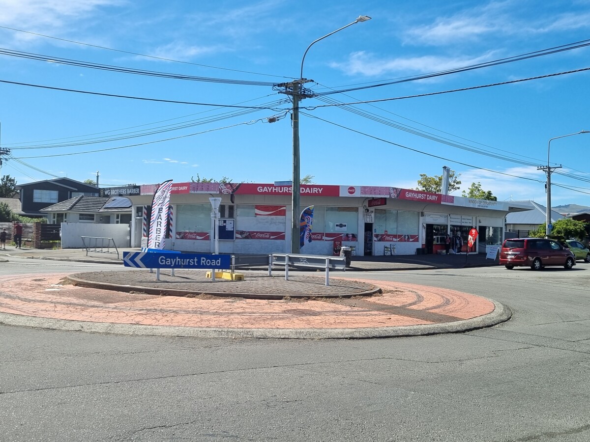 Gayhurst roundabout in the foreground with Gayhurst Dairy, WG Brothers Barber and Window of Opportunity stores in the background.