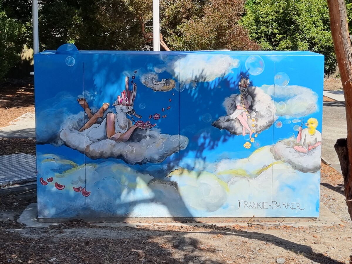 Street art facing 60 Marshland Road. Signed Frankie-Bakker. Some birds on clouds are engaging in whimsy.